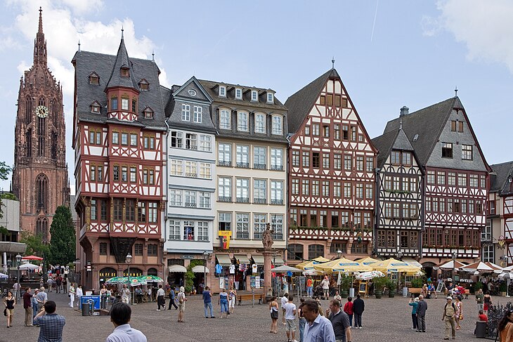 Площадь Рёмер – одна из самых примечательных достопримечательностей Франкфурта-на-Майне. Название её пошло от имеющейся здесь ратуши, и в переводе означает “римлянин”. В 1405 году городской совет купил местные здания у торговца Кунца, а на протяжении долгих лет было добавлено ещё девять зданий (всего их 11) и несколько внутренних дворов. На площади Рёмер произошло не одно значимое событие, о чем только свидетельствует 52 фотографии с запечатленными на них кайзерами.