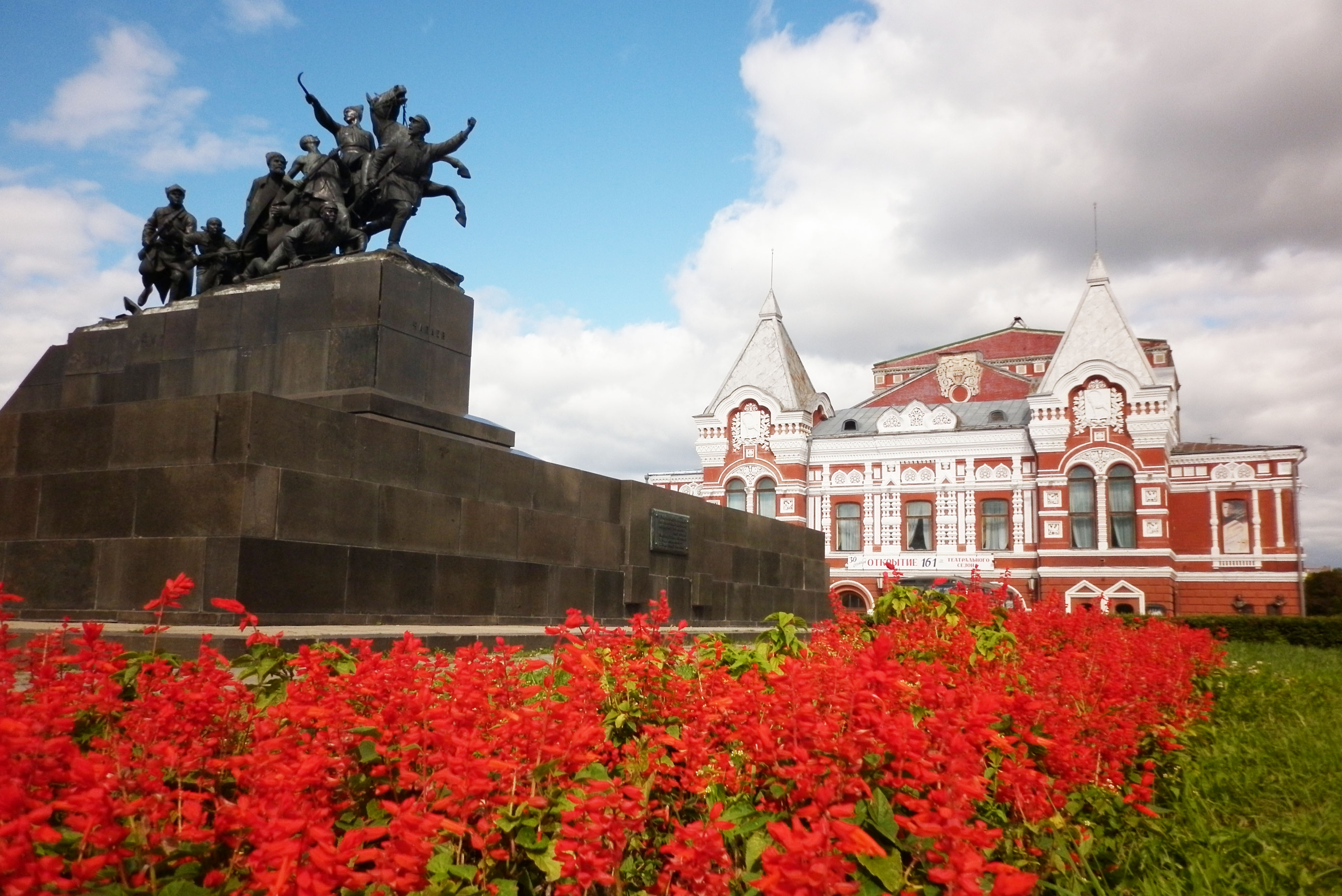 Памятник Чапаеву и Драматический театр на Чапаевской площади сегодня