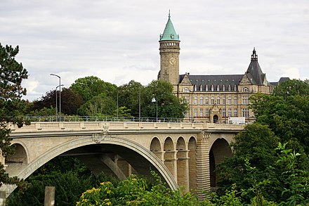 Мост АдольфаМост Адольфа — двухэтажный арочный мост в городе Люксембург на юге Люксембурга. Мост обеспечивает односторонний маршрут для дорожного движения через Петрюсс, от Королевского бульвара в Виль-От до авеню де ла Либерте в Гар. Его верхняя палуба имеет длину 153 м и имеет две полосы движения и две пешеходные дорожки. Его нижняя палуба, открытая в 2018 году, подвешена под верхней палубой, имеет длину 154 м и имеет выделенную двунаправленную велосипедную дорожку с доступом для пешеходов.По состоянию на 13 декабря 2020 года, после завершения второй фазы строительства новой городской трамвайной линии, мост обеспечивает двустороннее движение трамвая по своей верхней палубе. Мост Адольфа стал своего рода неофициальным национальным символом независимости Люксембурга и одной из главных туристических достопримечательностей Люксембурга. Мост был спроектирован французом Полем Сежурне и люксембуржцем Альбертом Роданжем и был построен между 1900 и 1903 годами. Его конструкция была скопирована при строительстве моста Уолнат-лейн в Филадельфии, США.