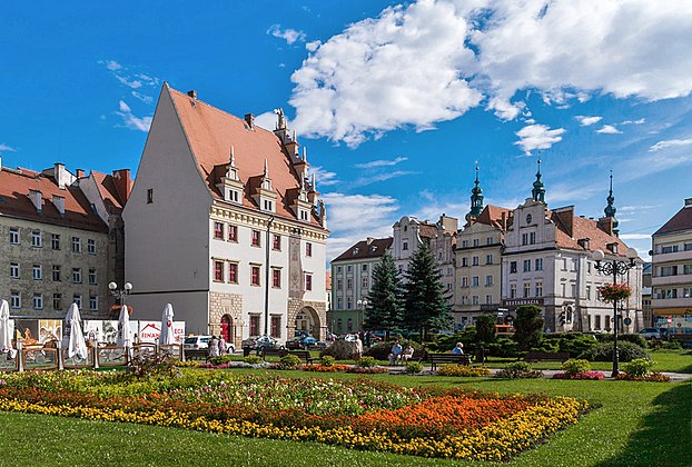 Самым фотогеничным местом является красочная Рыночная площадь с рядами расписных бюргерских домов и впечатляющая ратуша в стиле ренессанс, не уступающая по величию ратуше во Вроцлаве.