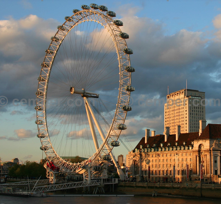 Высота «Лондонского глаза» или главного колеса обозрения в Лондоне составляет 135 метров. У этого колеса, издалека напоминающего глаз, всего 32 кабины с прозрачными стеклами, которые единовременно вмещают до 800 человек.