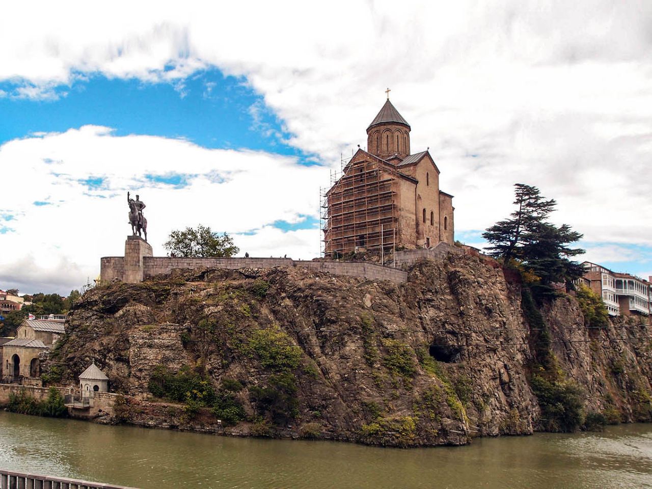 Храм Метехи в Тбилиси. Храм Метехи — еще один древний памятник Тбилиси XII века, расположившийся на краю скалистого берега Куры, который был крепостью и резиденцией грузинских царей. Под сводами этой старинной церкви в V веке молилась первая грузинская мученица — Св. Шушаник, отказавшаяся отречься от христианства, и за это закованная в темнице своим мужем до конца дней. Храм Метехи представляет собой высокую кирпичную площадь, церковь с круглой башенкой, покрытой остроконечной крышей, а в центре — остатки древнего крепостного комплекса замка, монастыря и храма. Прямо перед ним стоит современный памятник — бронзовая конная статуя Вахтанга Горгасали, основателя города.