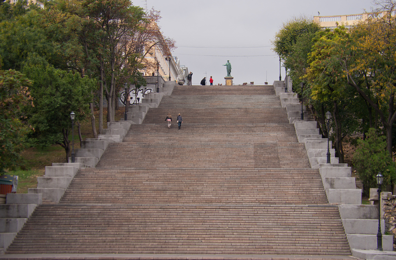 Одна из самых известных достопримечательностей Одессы — это Потемкинская лестница. Лестницы, соединяющие главные бульвары города с морем, по всей видимости, представляют собой оптическую иллюзию: если смотреть снизу шире, чем сверху, то сверху видны только площадки, а снизу — только ступени.Честно говоря, для нас это была огромная неудача. Это просто длинная широкая лестница. Плюс внизу лестницы — доки и очень некрасивый отель.