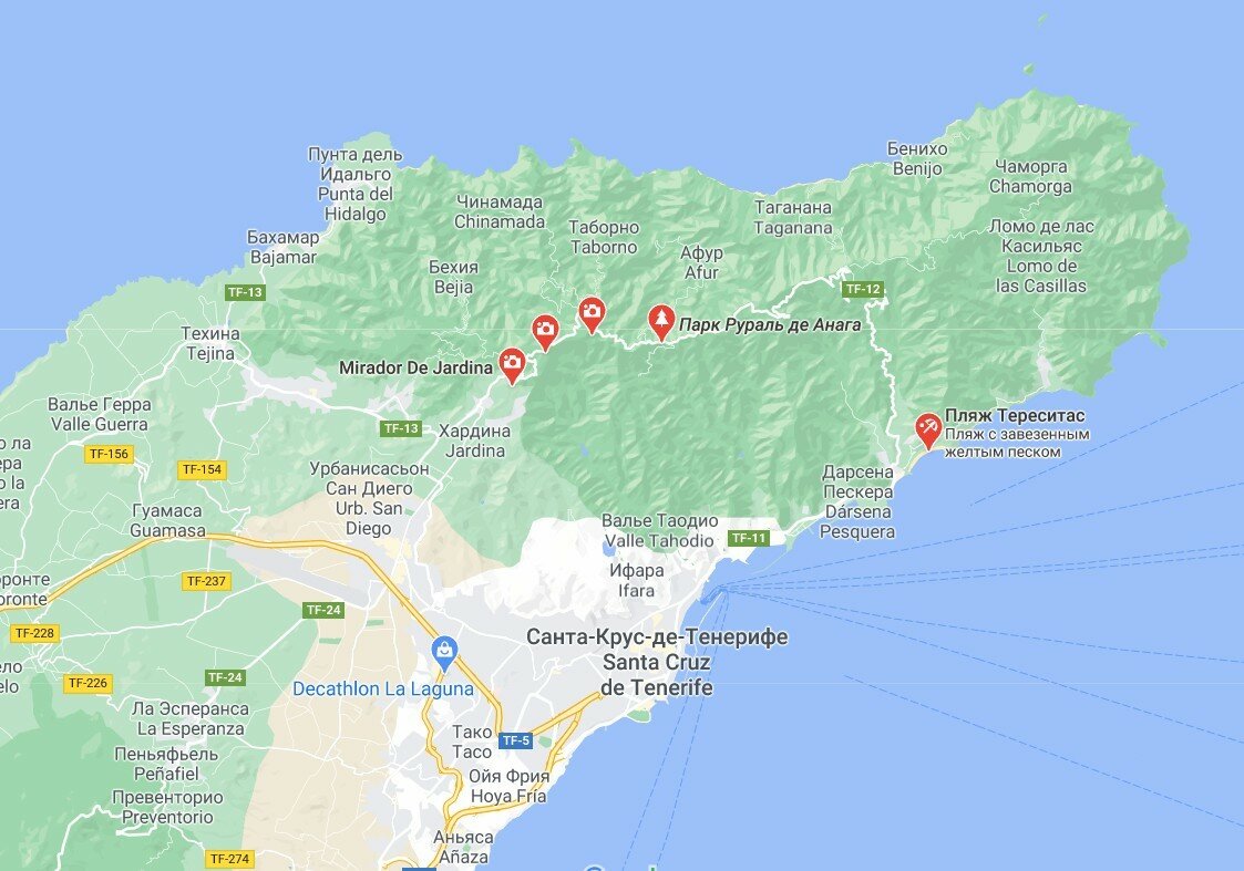 Карта Тенерифе: маршрут поездки вокруг Тенерифе на авто Не знаю почему, но я решил проехаться вокруг Тенерифе против часовой стрелки. Маршрут был запланирован такой:1. Тенерифе на машине – начало пути