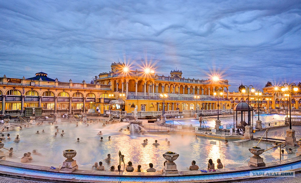 В купальнях Сечени, где большинство бассейнов открытые, температура еще выше — 75°. Это так много, что ее приходится охлаждать. Эти бассейны Будапешта тоже работают зимой. И выходить из воды иногда приходится прямо на снег.