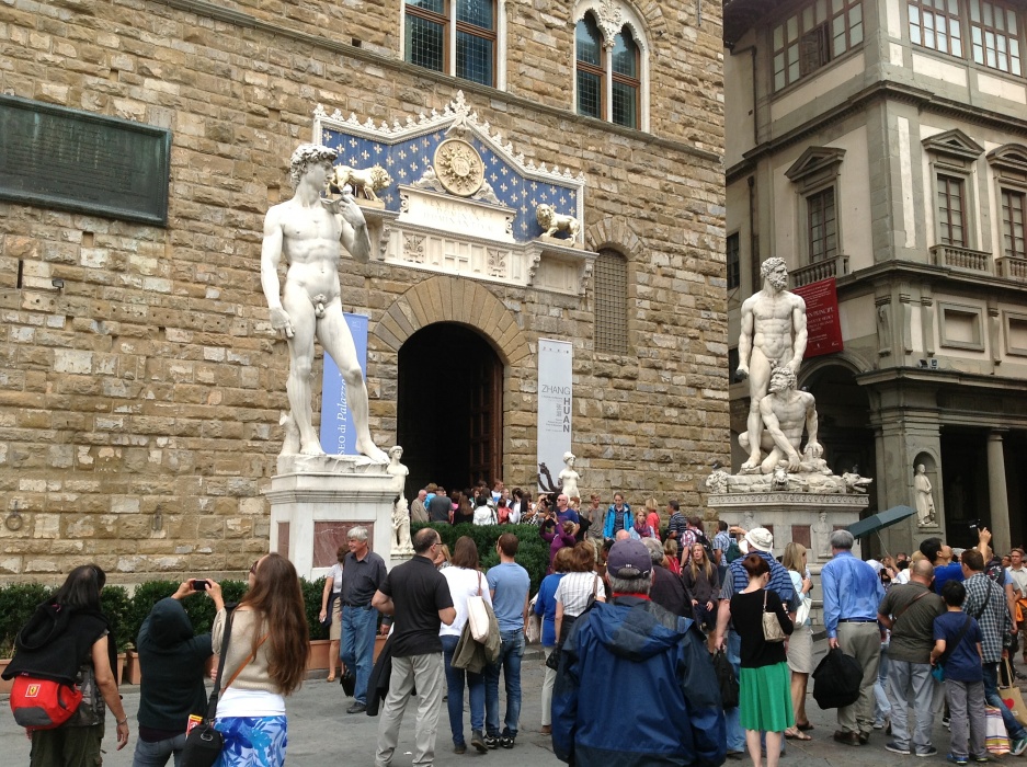 До 1873 года, Давид стоял не в Академии, а за пределами Палаццо Веккьо, бывшего дворца Медичи, а ныне ратуши Флоренции. Реплика David отмечает место, где когда-то стоял оригинал. Этот Дэвид с глупыми глазами и в парике, сбрасывающем голубиные волосы, кажется ошеломленным, когда туристы устраивают пикник у его ног, а женщины-полицейские проезжают мимо на лошадях.