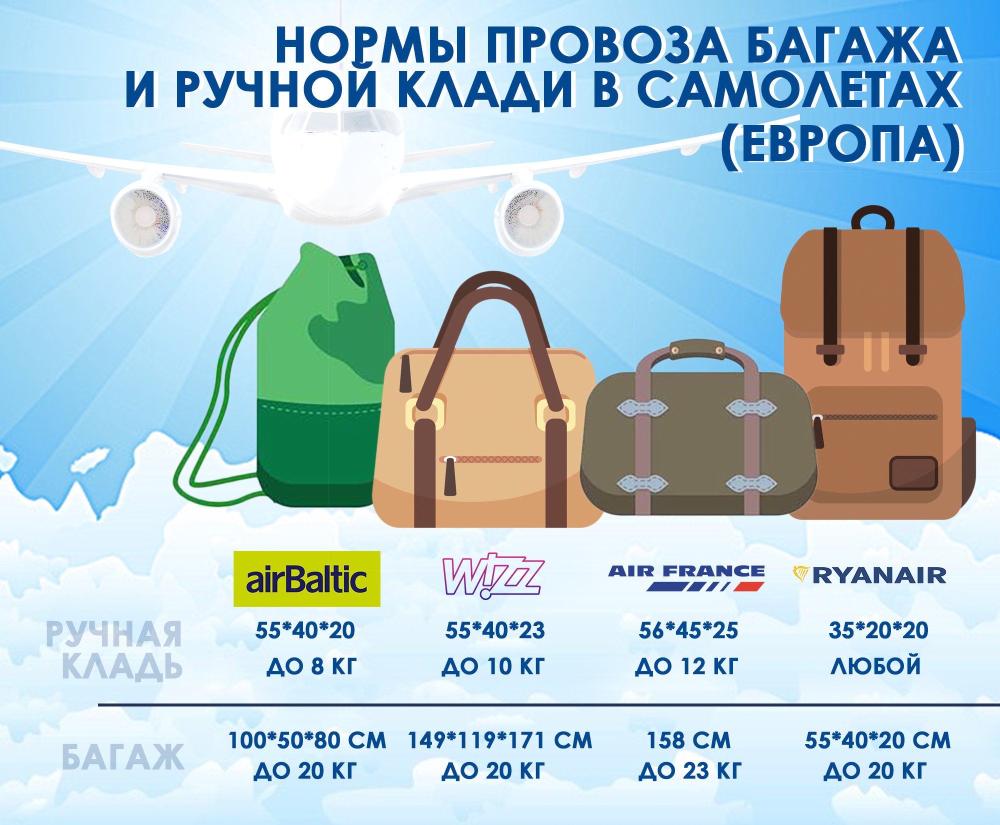 | Air France | 55 x 35 x 25 см | 12 кг |
