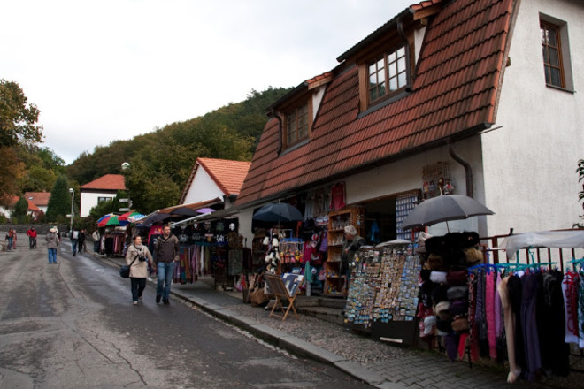 Дорога проходить через многочисленные лавки, магазины, закусочные, кафе и пивные. Найти замок Карлштейн помогут информационные указатели и стрелки.