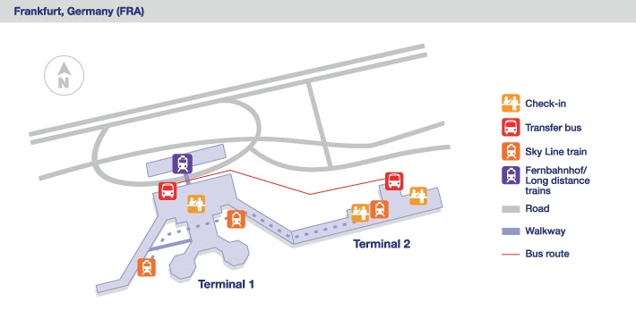 Аэропорт Франкфурта имеет два терминала – Терминал 1 (включает залы вылета А, В и С) и Терминал 2 (включает залы вылета D и Е).