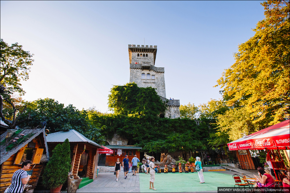 Высота горы Ахун составляет 663 метра, а высота сторожевой башни в римском стиле добавляет еще 30 метров.Он был основан (несмотря на свой средневековый вид) в 1936 году по личному распоряжению И.В. Сталин, которого впечатлили виды с горы, предложил установить там полноценную смотровую площадку с подъездной дорогой. Запрос был срочно выполнен всего за 3 месяца. Теперь в башне есть кафе, где можно согреться горячим чаем после пронизывающего ветра на вершине.