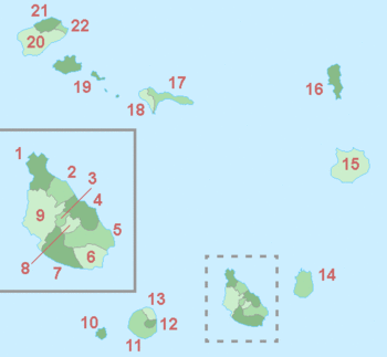 Кабо-Верде состоит из десяти главных и приблизительно восьми мелких островов. Главные острова (по часовой стрелке):