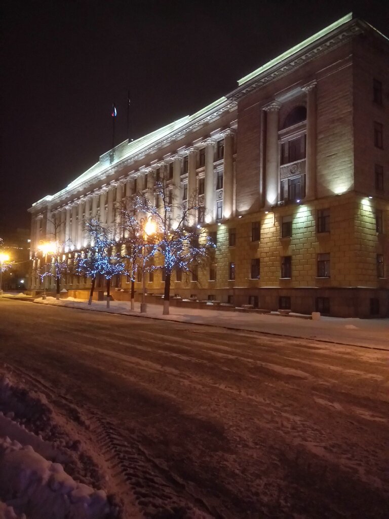 Старый дом и ТЦ «Гермес» по улице Кураева Сворачиваем опять на Московскую улицу. ФонтаныУже начинает смеркаться, и мы поворачиваем ко гостинице. Поблизости от неё наше внимание привлекает нарядный особняк, стоящий по улице Кирова. Он был построен в 1905 году и принадлежал купчихе Солнышкиной. Сейчас здесь располагается «Телеком-Сервис».
