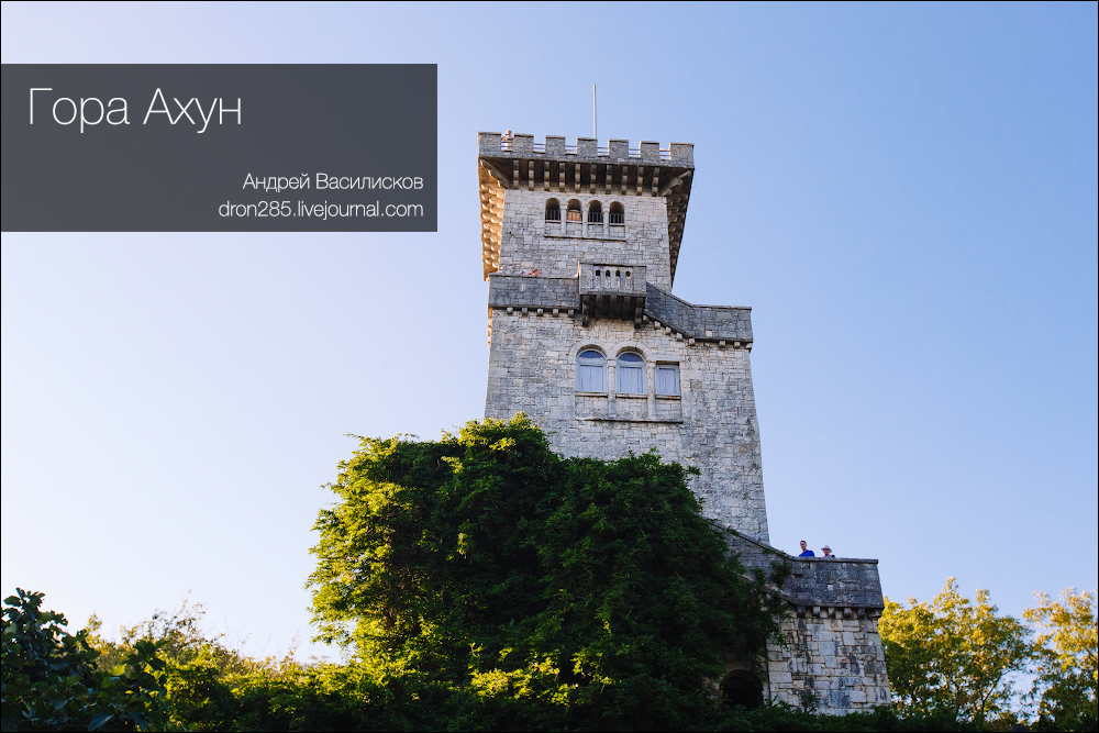Башня на горе Ахун, здание в романском стиле, было возведено в 1936 году по приказу Сталина в рекордно короткие сроки.Разработка проекта была поручена архитектору С. Воробьеву. Годом ранее к вершине была проложена автомобильная дорога. С верхней площадки открываются великолепные виды на горы, курортный город Сочи и Черное море (расстояние до берега, выраженного прямой линией, всего 3 километра). Если вы хотите подняться выше 30 метров, вам придется делать это пешком, но панорамный вид того стоит. Внутри башни есть дегустационный зал; Рядом расположен уютный ресторан «Ахун» и чайная.Расставлены резные арт-объекты, на небольшой территории устроена небольшая лужайка. Вдоль пешеходной дороги расположены крытые деревянные беседки и сувенирные лавки, а ближе к стоянке расположено кафе «Прохлада». Развлекательный центр ПИК 701 с самой высокой точкой обзора в Сочи расположен в нескольких сотнях метров от башни Ахун.