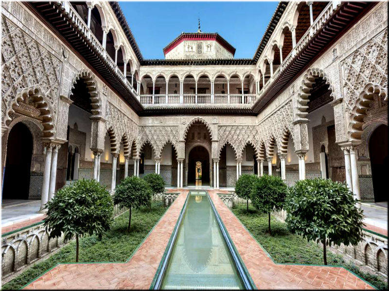 Внутреннее убранство комплекса Альгамбра гармонично сочетает в себе живописные сады и внутренние дворики, украшенные фонтанами, водоемами и каналами с множеством изысканных арок, колонн и резных окон. Все это декорировано с традиционными арабскими вязями, пестрой керамической мозаикой, растительными орнаментами и резными узорами по камню и дереву.