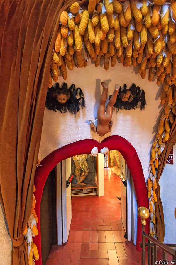 25. Вход в рабочую студию Дали. Справа — бюст Веласкеса — одного из излюбленных художников Дали, которым он всегда восхищался. Посередине — графический портрет Гала. На потолке — панно «Дворец Ветра» с элементами образной системы Дали (см.