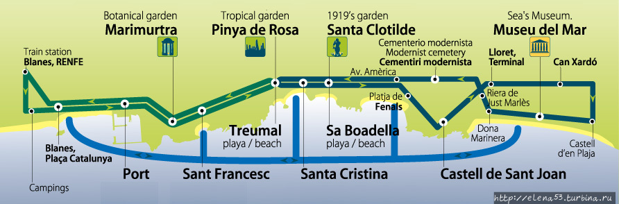 В Барселоне туристам нужен вокзал Sants, самая ближняя к нему станция метро – Sants –Estaci? на линиях L3 и L5. От вокзала в течение 80 минут доезжаем до станции Blanes Estacio. В Бланесе автобусная остановка находится у самого выхода с вокзала, нужно пройти через турникеты, чтобы попасть на нее. Расходы на дорогу получаются следующими: 6,95 евро на билет на поезде, 1,65 евро на автобусе. Всего в оба конца получится чуть более 17 евро на человека.