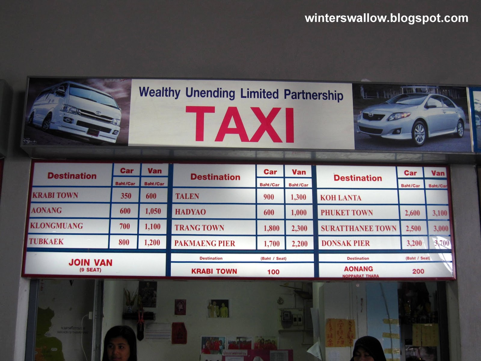 Краби аэропорт: Такси от аэропорта до Краби работают по фиксированному тарифу, оплатить который необходимо заранее. Пассажиру нужно найти кабинку, расположенную внутри терминала, и приобрести в ней билет. Затем нужно выйти на улицу и выбрать такси. У всех такси обязательно в наличии должна быть лицензия аэропорта.