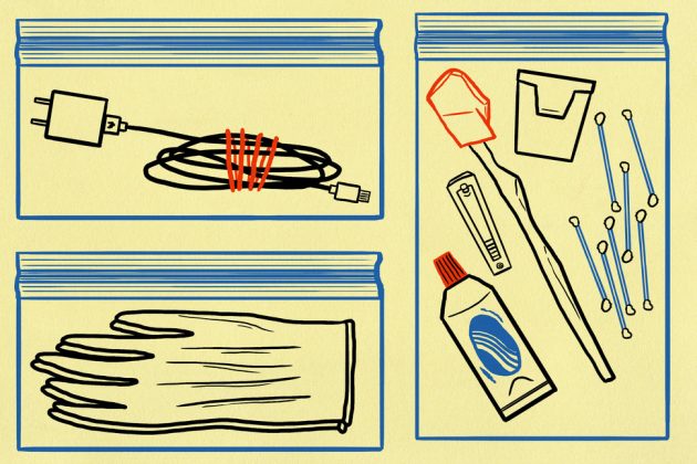 Сверху обязательно оставьте чехол или сумку с предметами первой необходимости. Содержимое полностью зависит от того, куда вы едете, но есть и универсальные вещи: документы, зарядка для телефона, наушники, лекарства, перекус, сменная одежда — всё, что нужно быстро достать из чемодана.