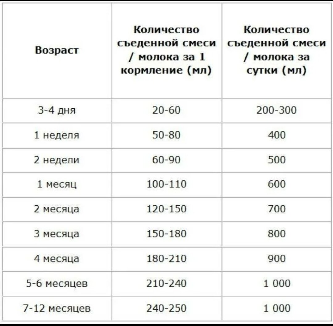 - 0-1 месяц: 7-8 кормлений по 60-90 мл