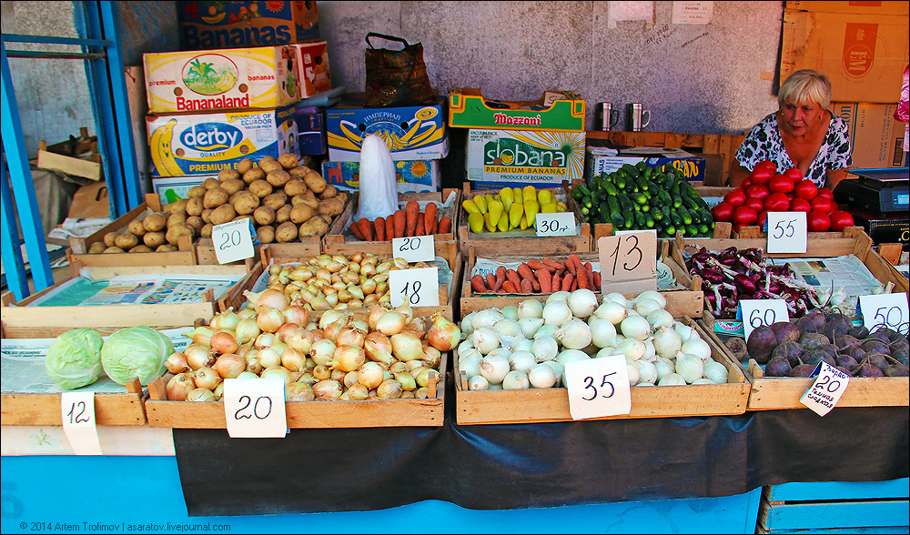На рынке и в магазинах в полном ассортименте представлены летние овощи — картофель, свекла, морковь, капуста, лук, брокколи. Много недорогих ароматных огурцов. Крымтеплица стабильно поставляет на рынок огурцы среднего качества по приемлемым ценам. Чуть дороже стоят помидоры. Все овощи местные, крымские, цены на которые достаточно лояльные.