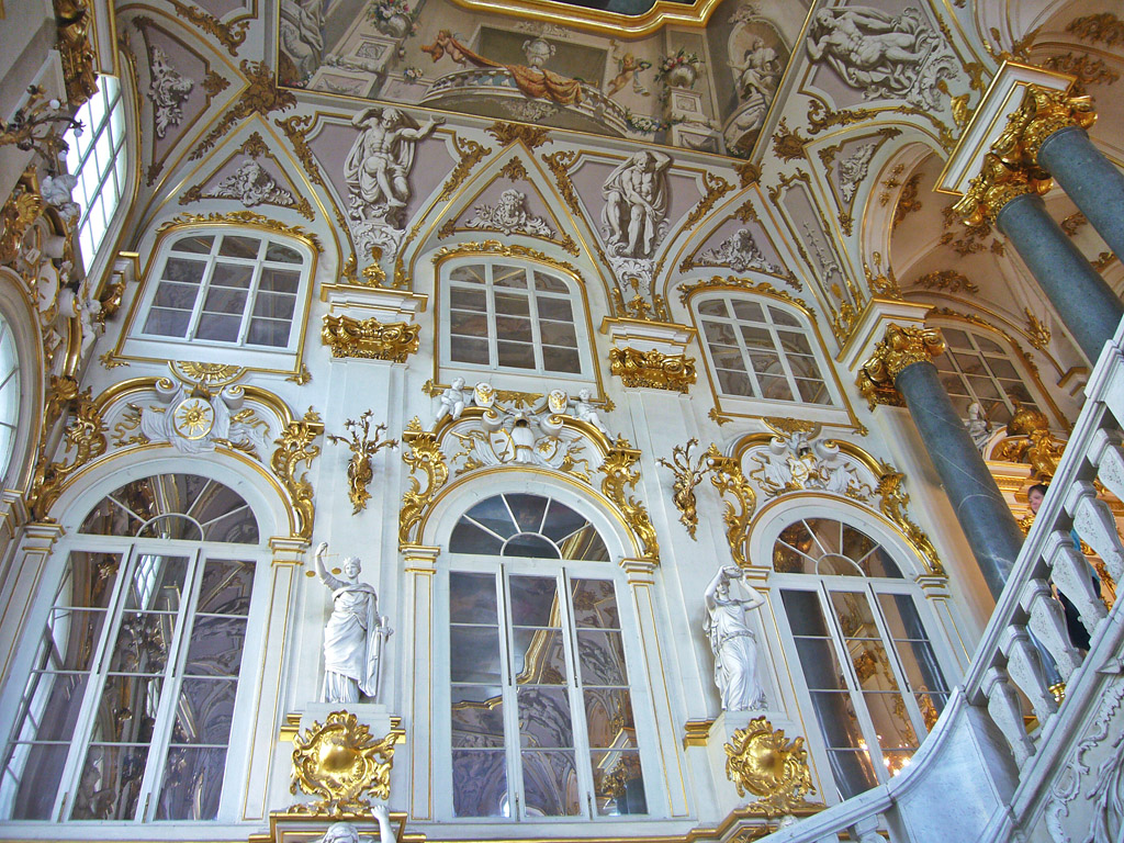 В последовавшей за этим анархии была разграблена часть богатств Зимнего дворца, в том числе огромные имперские винные погреба (хотя грабежи не распространялись на Эрмитаж). Посольская (Иорданская) лестница в Зимнем дворце / Эрмитаже