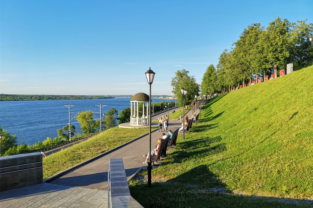 Растянулась Пермская набережная на 3,8 км. Спуститься на нее удобно с Речного вокзала. Предусмотрены еще 2 варианта: от Коммунального моста и Соборной площади. Пешеходная зона обустроена: ночью зажигаются неяркие фонари, можно отдохнуть на скамейках. В воздухе витает аромат цветов, которые целое лето украшают клумбы. В перспективе здесь планируется обустройство лаунж-зон, фонтанов, арт-пространства.