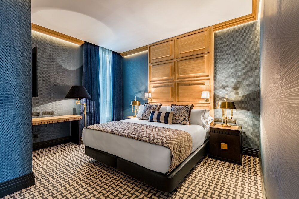 — самый новый в городе Этот звездный отель расположен в элегантном здании Прекрасной эпохи в самом умном районе Мадрида. Его изысканные интерьеры созданы известным дизайнером Лоренцо Кастильо.Синие шелковые панели украшают стены ресторана Haroma, которым курирует Марио Сандовал, обладатель двух звезд Мишлен. В номерах есть обои с ручной росписью оливкового и золотого цвета, они обставлены антикварной мебелью и оригинальными произведениями искусства. Если у вас возникнет особый вопрос, то цветочная терраса на крыше этого роскошного отеля должна соответствовать всем требованиям.