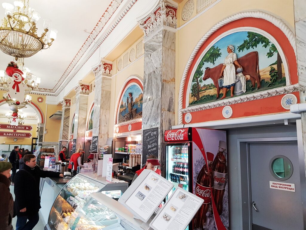 На трех этажах можно найти практически все: косметику, одежду, предметы домашнего обихода, ткани, сувениры. Это место — отличное напоминание о том, какими были покупки 30 и более лет назад. Даже если вы не планируете делать покупки, все равно стоит зайти в ГУМ.Интерьер действительно красивый, в грандиозном советском стиле. С левой лестницы на верхний этаж открывается прекрасный вид на проспект Независимости, на самом деле это одна из лучших панорам этой улицы, которые только можно найти.
