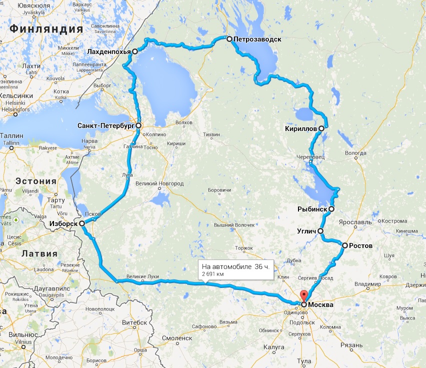 Также большой популярностью у автомобилистов пользуется маршрут по Карелии и Ленинградской области, проложенный вокруг Ладожского озера. В этом случае дорога пролегает через следующие пункты: