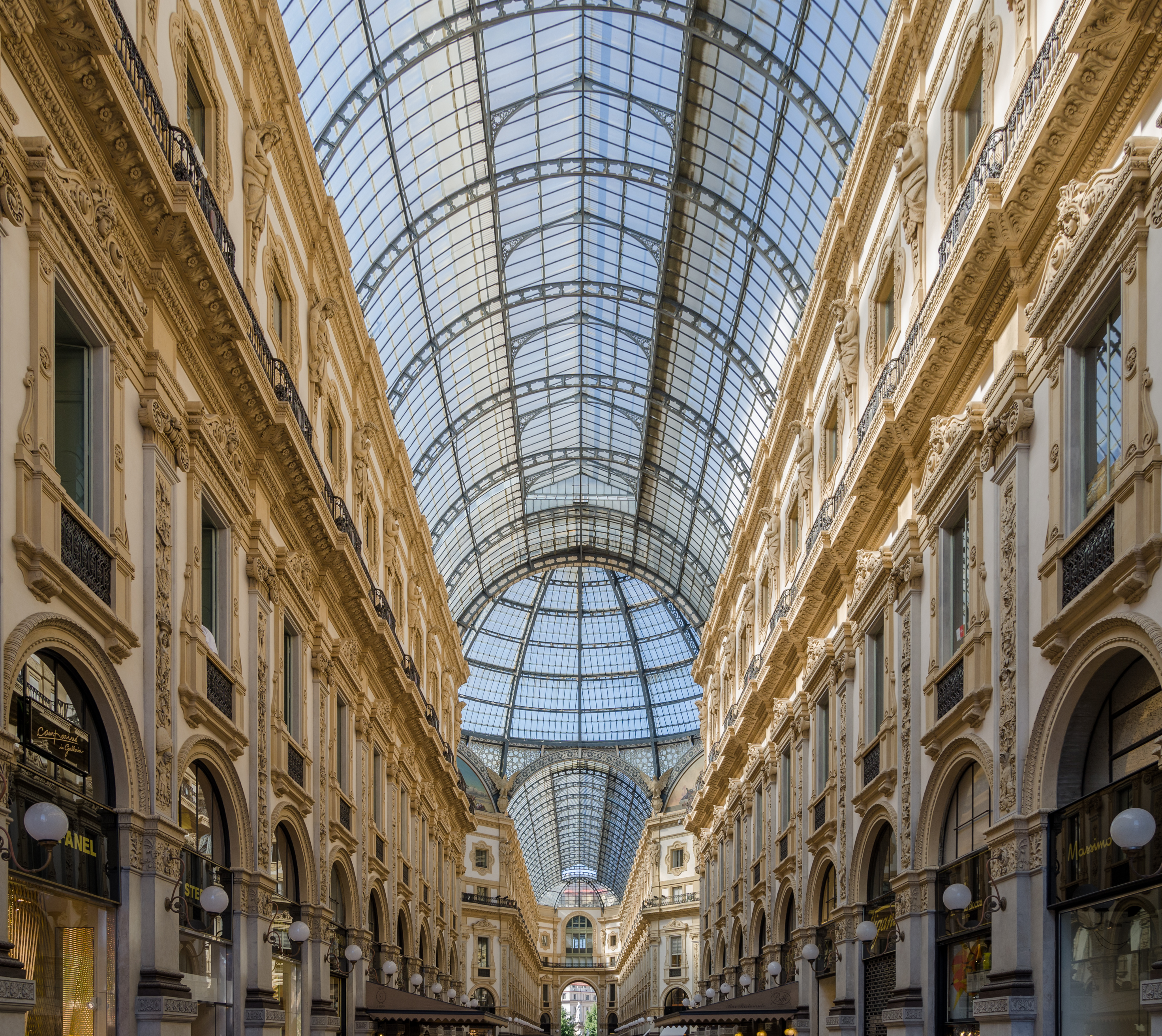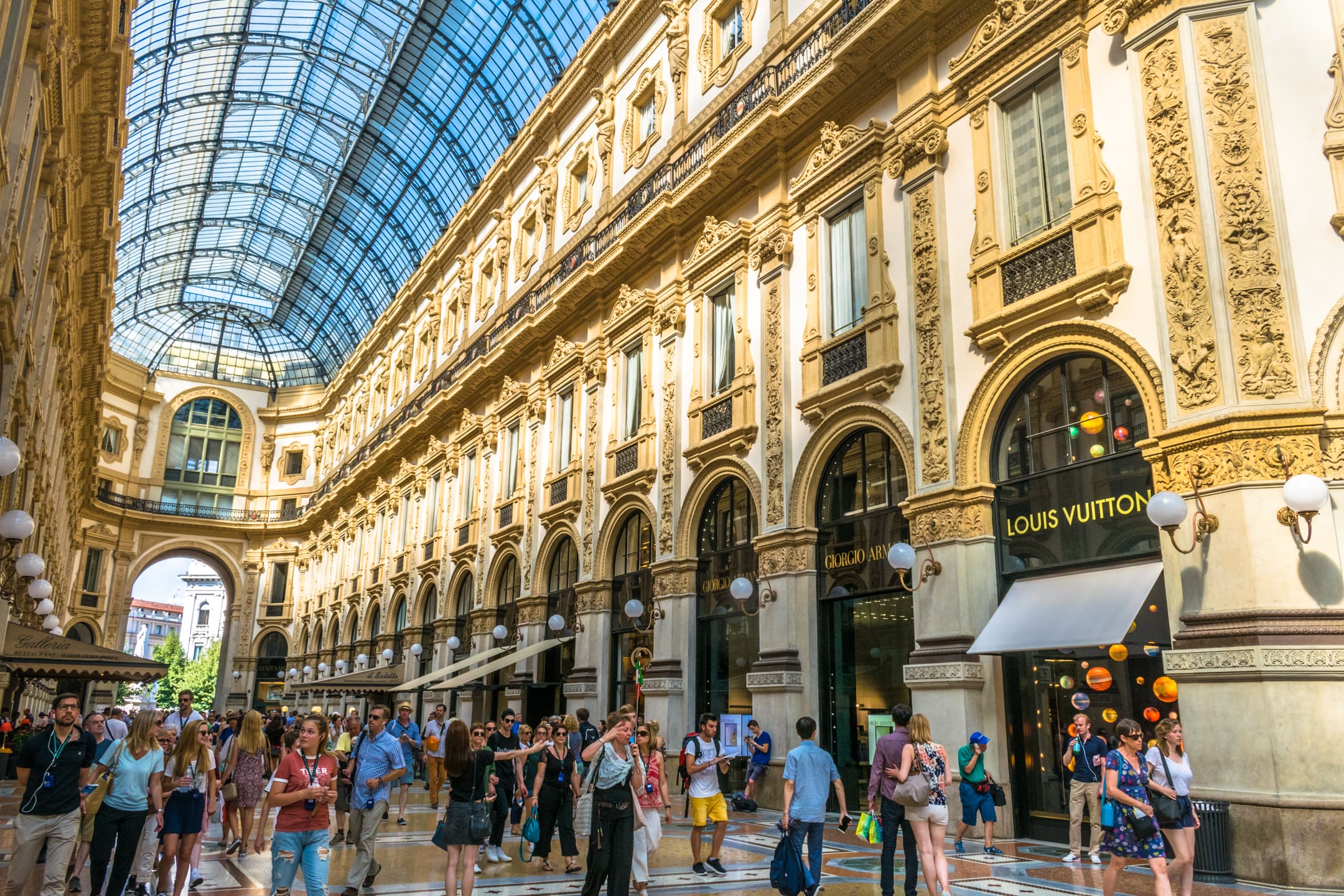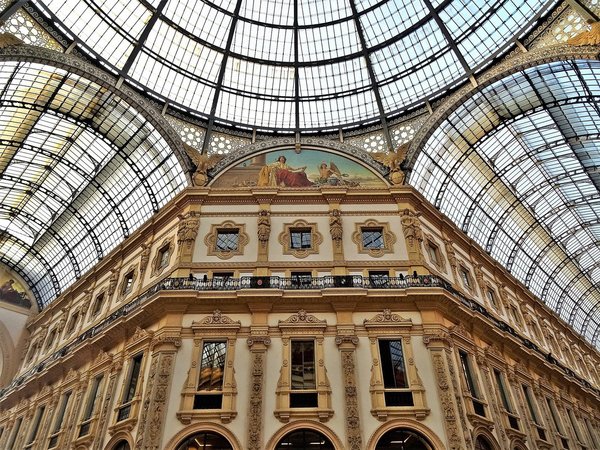Galleria — это старейший торговый центр Италии , который, красиво украшенный мозаикой и кариатидами вокруг окон и балконов, сохранил свой блеск.