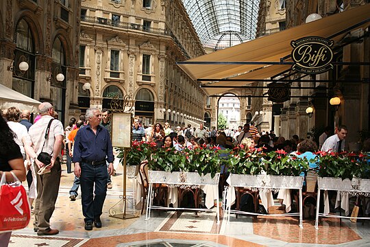 магазинов роскошных брендов в аркаде, которые могут легко конкурировать с магазинами на Виа Монтенаполеоне или Виа делла Спига, соседствуют с ресторанами классической белой скатерти , закусочными знаменитых шеф-поваров, легендарными заведениями , такими как бар Camparino и знаменитый художественный книжный магазин Bocca, расположенный в Galleria с 1930 года, но значительный культурный центр города с девятнадцатого века.