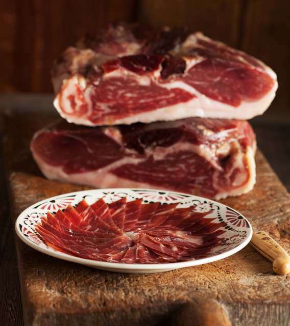 Настоящая вяленая ветчина jamón ibérico de bellota, , приготовленная из свиней на свободном выгуле, которых кормят желудями, является ключевой частью испанской жизни, особенно на юге.