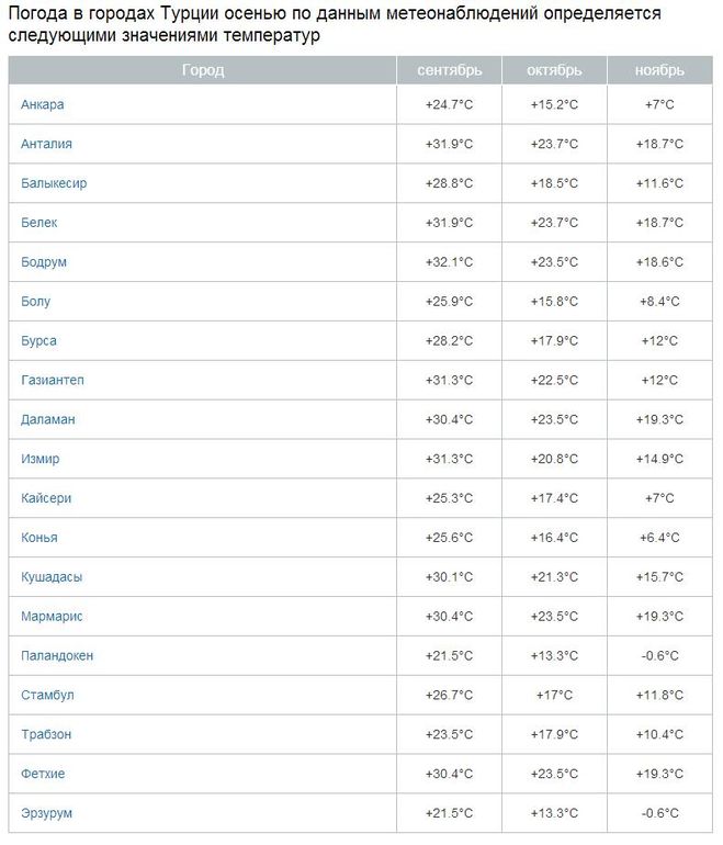 В сентябре в Турции температура воздуха начинает снижаться, но днем еще тепло, местами даже жарко. На курортах Анталии, Сиде, Белеке днем +30℃. Температура воды в море в Турции в сентябре: +24-28 ℃. Теплее всего на Средиземном и Мраморном море. Самое холодное — Черное море.