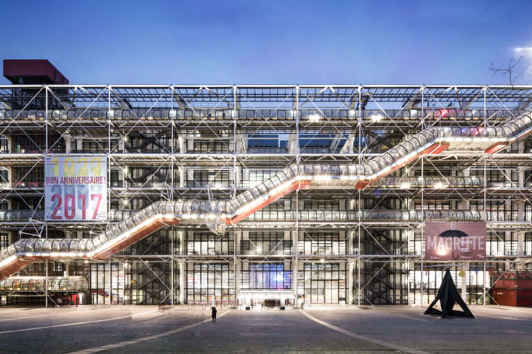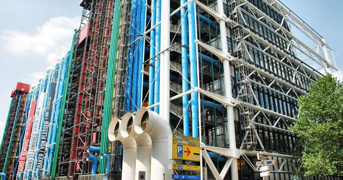 Когда в 1977 году был открыт Национальный центр искусства и культуры Жоржа Помпиду , или Центр Помпиду, его радикальный дизайн потряс мир. Французский музей имеет драматический, яркий и индустриальный внешний вид, демонстрирующий такие материалы, как трубы, трубки и электронику. Кроме того, в дизайне здания не было попытки слиться с окружающей территорией, квинтэссенцией района изящных искусств.