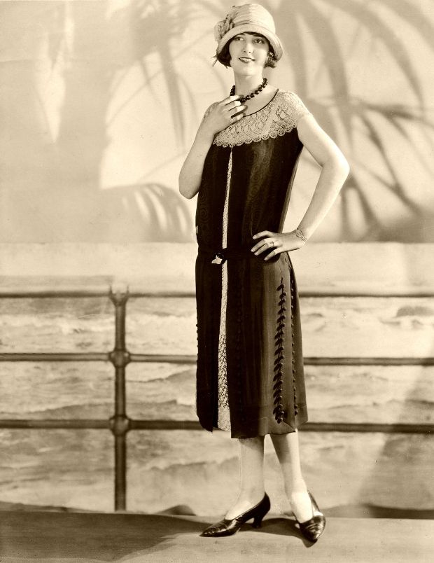 Нарядные платья модницы дополняли головной лентой, декорированной цветками, перьями, блестками. Сумочка для вечернего выхода в свет подбиралась в виде конверта, который носился под мышкой, а не на лямке.