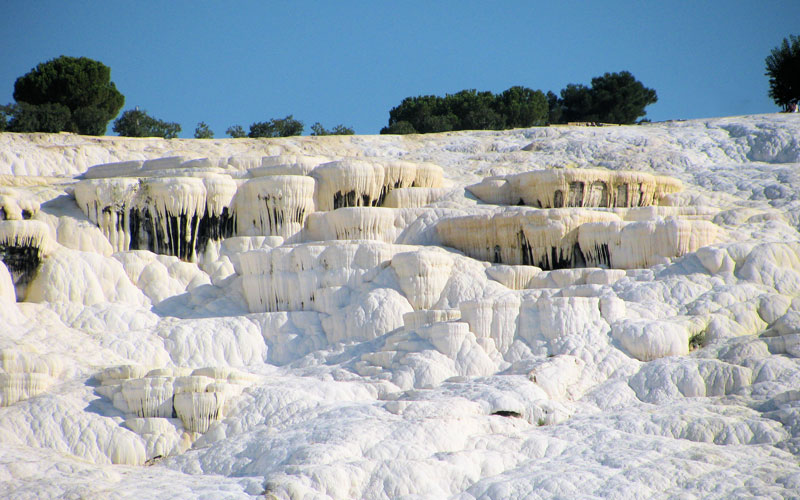 ТравертиныВысокий холм с белоснежными травертинами и террасными ваннами был создан тёплыми термальными водами богатыми карбонатами. Они, вытекая, образовали известковые отложения.