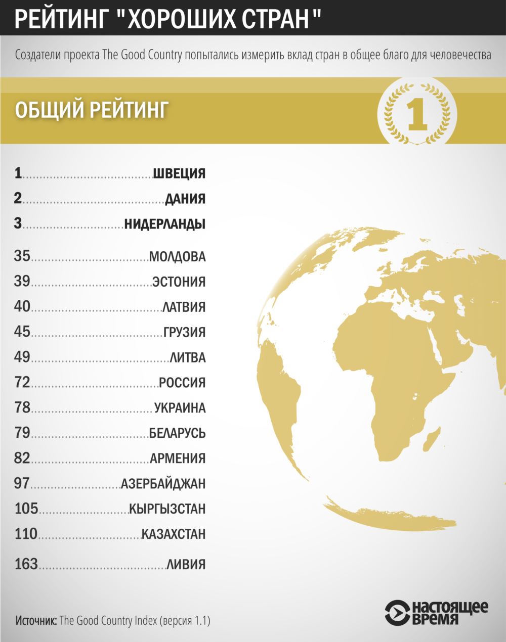 Впрочем, учитывались и другие критерии: например, является ли страна государством с низким или средним доходом на душу населения, а также является ли территория страны большой или маленькой. Россия в списке лучших не значится.