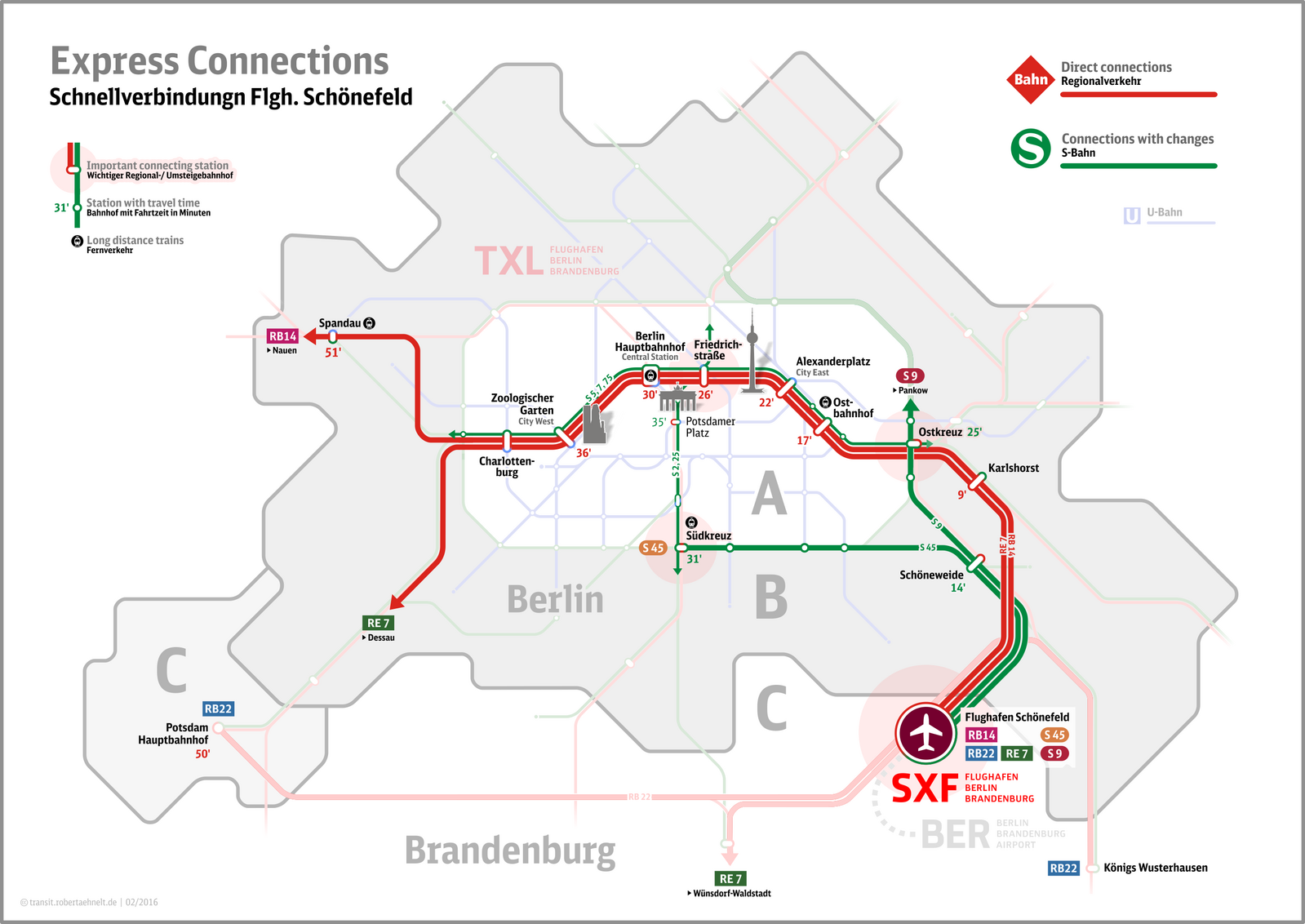 См. Также Транспорт в аэропорт Берлина-Бранденбург, чтобы добраться до аэропорта из других частей Берлина, и Airport Express для удобного железнодорожного сообщения с Центральным вокзалом Берлина и другими пунктами назначения в центре Берлина.