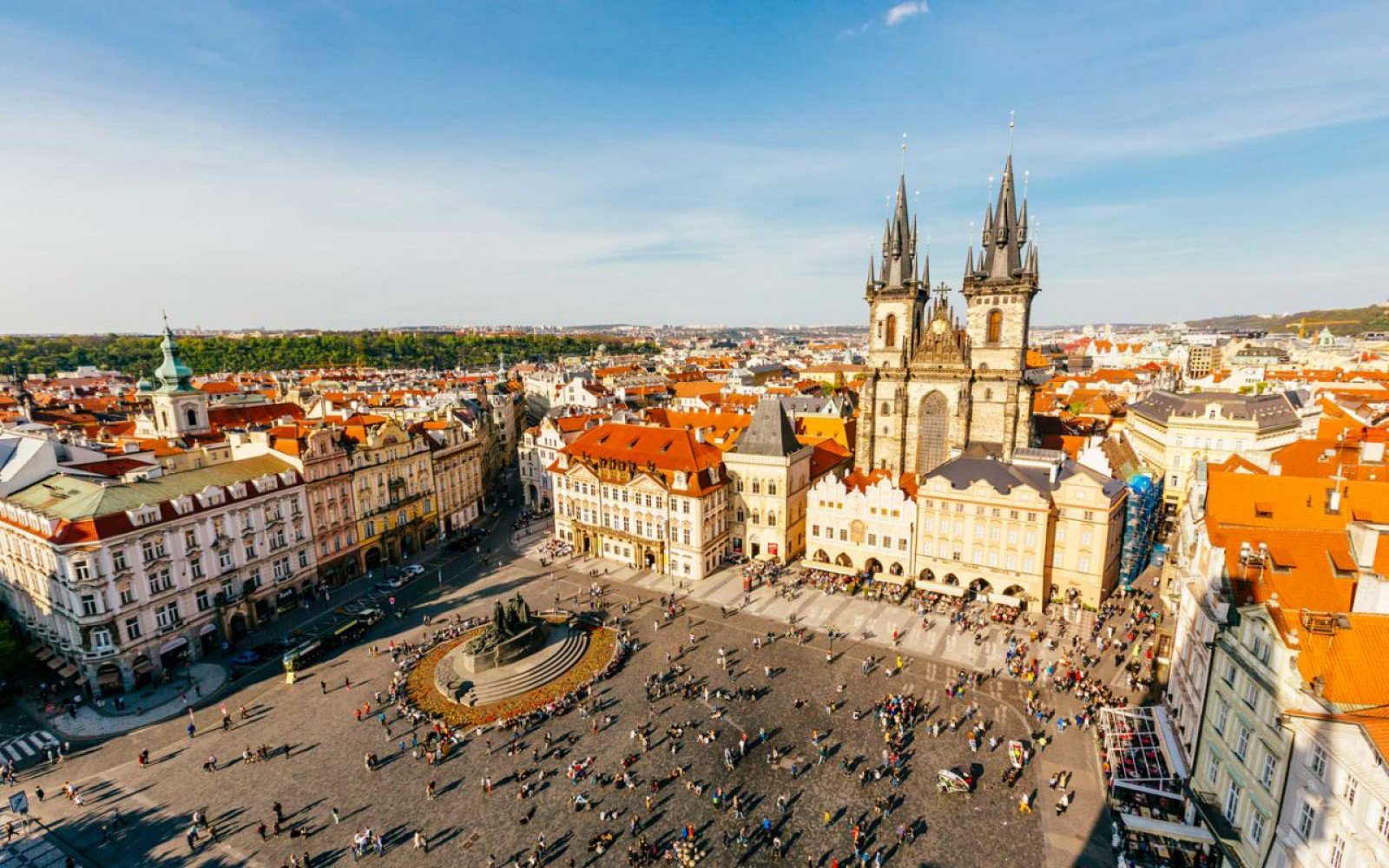 Площадь окружена историческими строениями разных эпох и стилей. Величественный храм Девы Марии перед Тыном, дворец Гольц-Кинских, церковь Святого Николая и поражающий своей драматичностью памятник Яну Гусу.