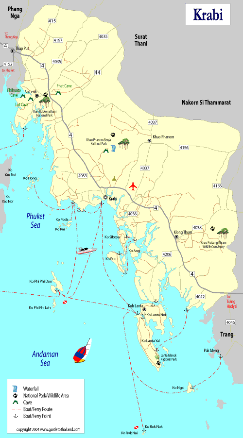По суше Краби и Пхукет находятся на расстоянии 180 километров друг от друга, а по морю расстояние в три раза короче. Кроме того, между этими местами ходят регулярные автобусы, но нет железнодорожного сообщения, так как Пхукет — отдельный остров.