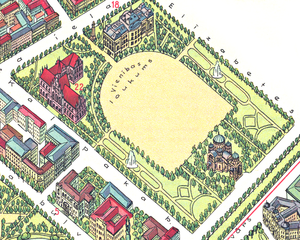 Другая (главная) ось парка была перпендикулярна первой и проходила слева от собора — широкая аллея с фонтанами и цветочными партерами.