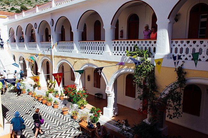 «Предание (и знаменитая поэма Фридриха Гельдерлина 1802 года «Патмос») утверждает, что святой Иоанн Богослов («О Теологос» по-гречески) написал Книгу Откровений Нового Завета на Патмосе сразу после 95 г. н.э.», говорит Марк Дубин. «Хотя в последнее время ученые считают, что он был совершенно другой личностью, чем автор одного из четырех Евангелий. Тысячелетие спустя монах Христодулос основал на вершине острова внушительный укрепленный монастырь святого». Этот монастырь является главной достопримечательностью острова и придает ему «ощутимо духовную атмосферу», но здесь также есть отличные пляжи, художественные бутики и прекрасные виды, привлекающие отдыхающих.