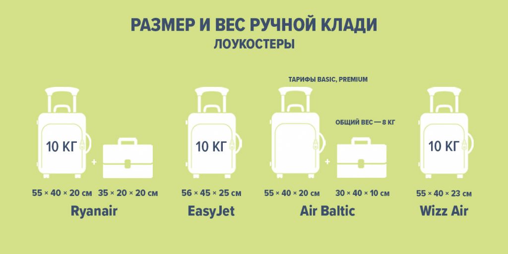 - Размерная часть не должна превышать параметров 55×40×23 см — вполне реальный размер багажа для краткосрочной поездки.