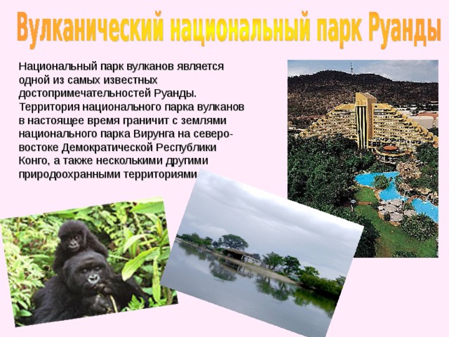 Национальный парк вулканов Вирунга в Руанде расположен в самом сердце Африки на высоте от 2 до 4,6 километров над уровнем моря. В парке 6 потухших вулканов, от которых он и получил свое название.