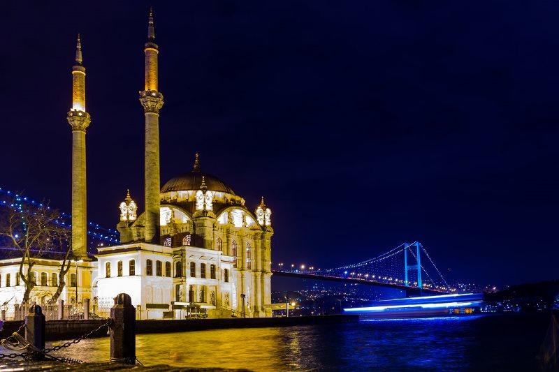 Стамбул — город, наполненный мечетями и дворцами, и когда солнце садится, все они красиво освещены, что позволяет прохожим любоваться ими даже в темноте. Одной из самых красивых мечетей, которую стоит посетить ночью, является мечеть Ортакёй. Расположенный на берегу площади причала Ортакёй, он является одним из самых привлекательных для Instagram мест на Босфоре.
