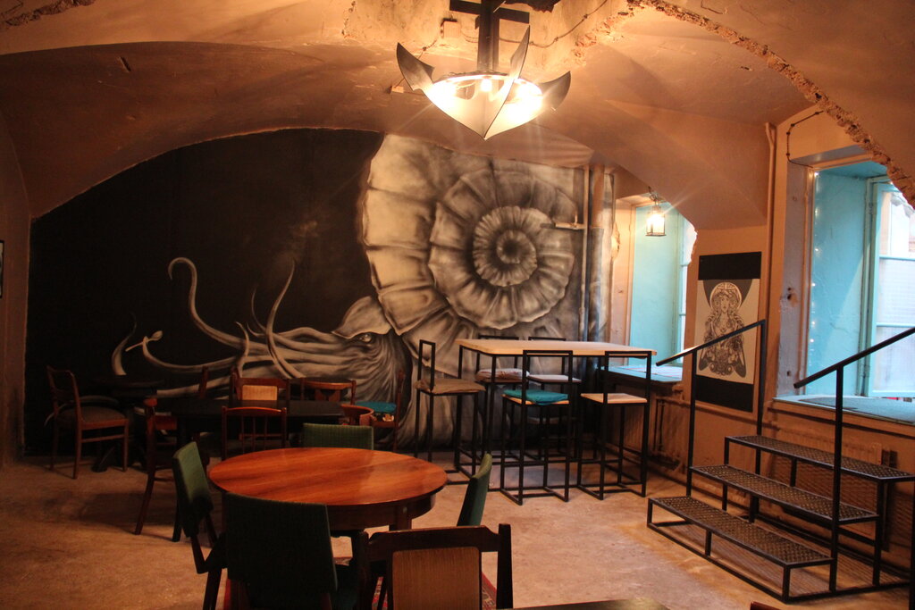 После переезда заведение все также предлагает гостям обширную культурную программу и недорогое меню с интересными позициями. Так, по вечерам здесь играет живая музыка, идут кинопоказы и лекции, а по выходным устраивают вечеринки с диджей-сетами (следите за анонсами в соцсетях).