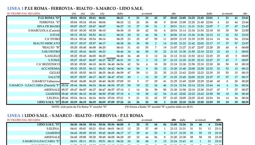 LE ROMA (S.Chiara) «F» — FERROVIA «B» — RIVA DE BIASIO «B» — SAN MARCUOLA «B» — SAN STAE — CA ‘ Д’ОРО — РИАЛЬТО МЕРКАТО — РИАЛЬТО «D» — САН ТОМА «А» — САН САМУЭЛЕ — АККАДЕМИА «А» — САН МАРКО ВАЛЛАРЕССО «B» — САН МАРКО/САН ЗАКАРИЯ «F» — ДЖАРДИНИ «B» — САНТ’ ЕЛЕНА «С» — LIDO S.M.E. «Д»