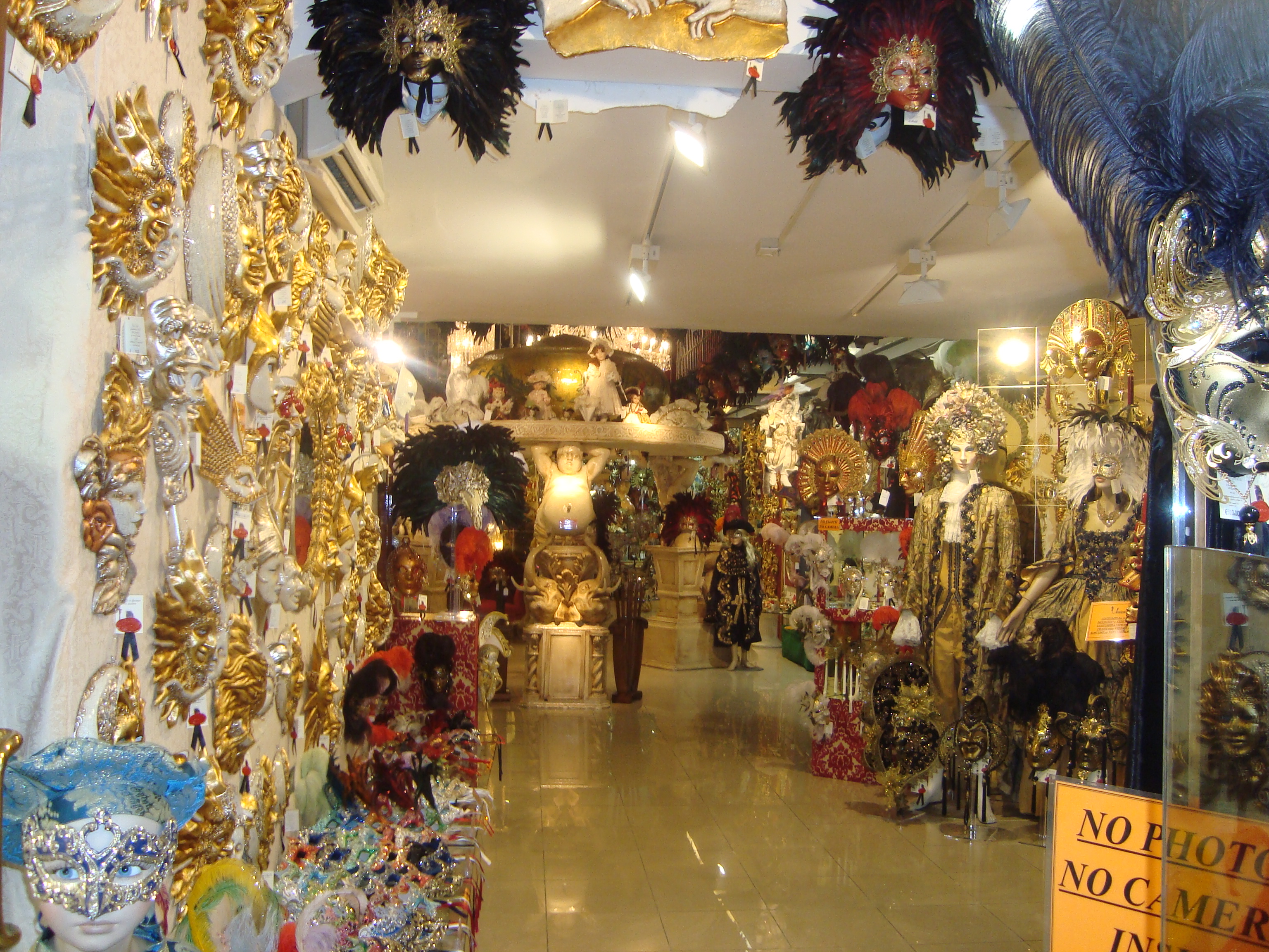 Tragicomica по 2800, calle dei Nomboli, сайт магазина tragicomica.it. Здесь маски очень дорогие, предлагается услуга — к выбранной маске подобрать карнавальный костюм из коллекции магазина. Для покупателей часто организуются экскурсии по все отделам магазина;