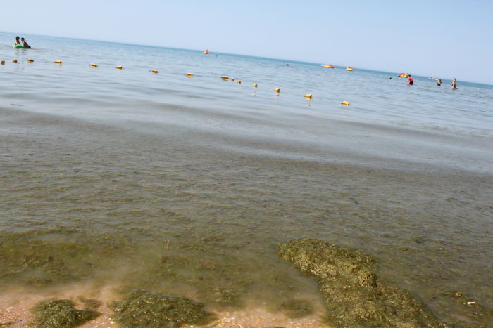 Почему же цветет вода? Побережье Витязево очень мелкое, соответственно море быстро прогревается, а затем начинает цвести. С середины июня и по конец августа вы увидите водоросли по всему песчаному побережью. Скажем прямо, выглядит такая «картина» не очень эстетично, даже иногда купаться становится, мягко говоря, не приято. А на центральном пляже еще хуже ситуация, поэтому лучше ходить плавать на Высокий берег.