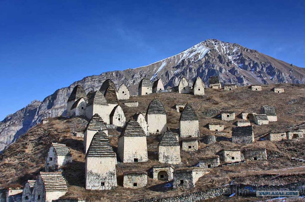 На выезде из Даргавса в сторону Кармадонского ущелья придорожный щит желает всем счастливого пути. И сразу взору открывается Город мертвых – почти сотни каменных склепов в виде надземных фамильных усыпальниц, в которых когда-то хоронили горцев. Сегодня этот историко-архитектурный памятник охраняется государством.